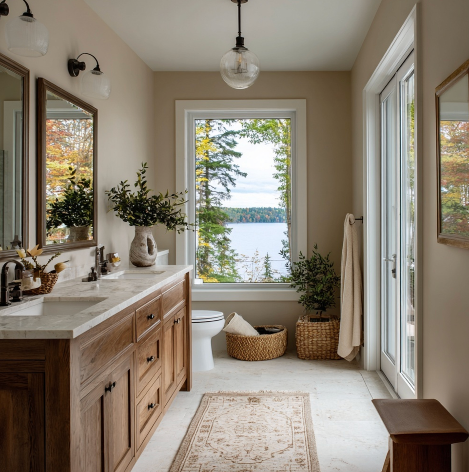 Light paint, durable floors, classic fixtures — this is quiet luxury. You don’t need to chase trends when nature already provides the show.